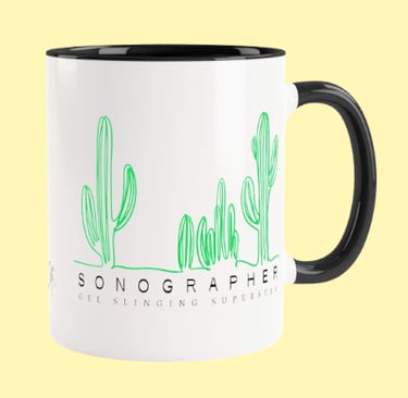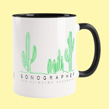 Whether you are from the deserts in the south west or you do your gel slinging in the cities of the north east, we all like to wet our whistle from time to time. This fun coffee (or tea) mug comes in two sizes, and with line art of cacti and the quote "Sonographer - Gel Slinging Superstar" will add a bit of flair to your day.